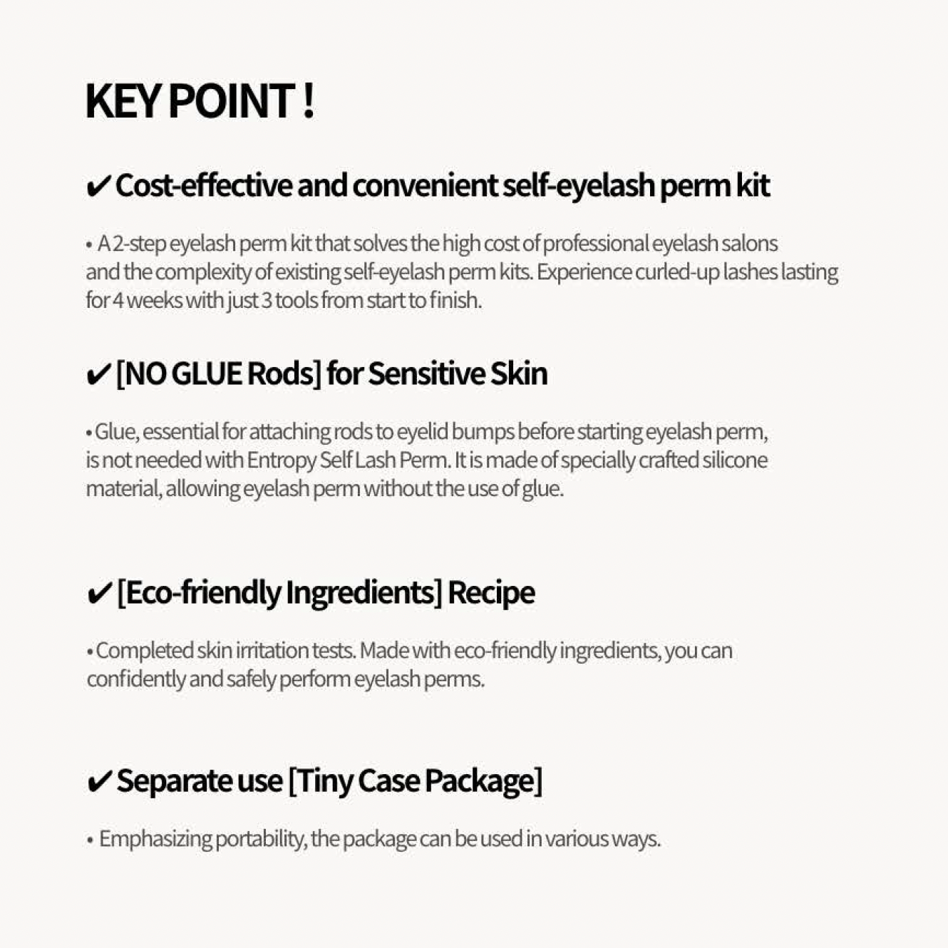 – Cost-effective and convenient self-eyelash pen kit: * A 2-step eyelash perm kit that solves the high cost of professional lash salons and the complexity of existing self-eyelash perm kits. Experience curled-up lashes lasting for 4 weeks with just 3 tools from start to finish. – [NO GLUE rods] for Sensitive Skin: * Glue, essential for attaching rods to eyelid bumps before starting eyelash perm, is not needed with Entropy Self Lash Perm. It is made of specially crafted silicone material, allowing eyelash perms without the use of glue. – [Eco-friendly Ingredients Recipe]: * Completed skin irritation tests. Made with eco-friendly ingredients, you can confidently and safely perform eyelash perms. – Separate use [Tiny Case Package]: * Emphasizing portability, the package can be used in various ways.
