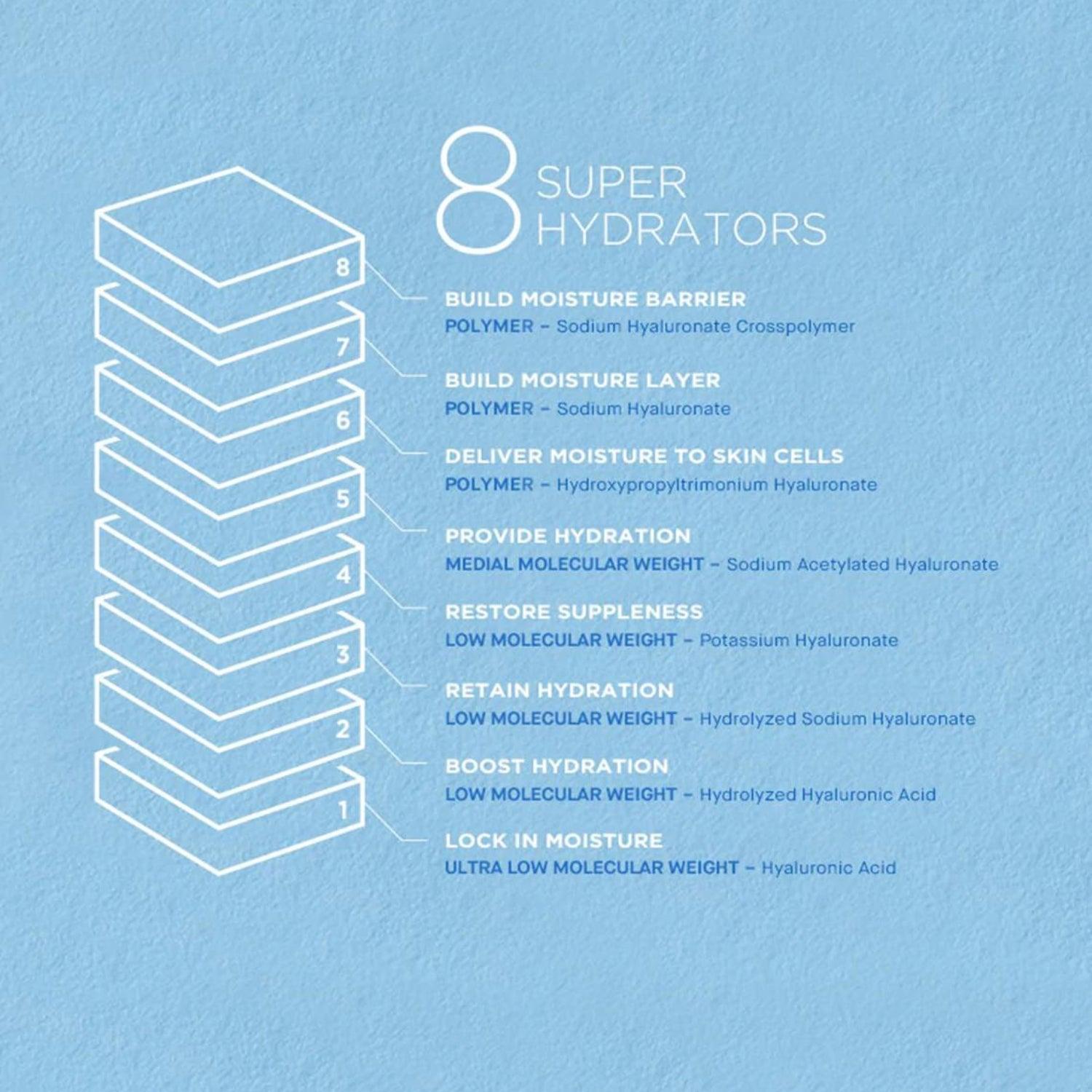 Water, Glycerin, 1,2-Hexanediol, Dipropylene Glycol, Panthenol, Sodium Hyaluronate, Hydroxypropyltrimonium Hyaluronate, Hydrolyzed Hyaluronic Acid, Sodium Acetylated Hyaluronate, Hyaluronic Acid, Hydrolyzed Sodium Hyaluronate, Sodium Hyaluronate Crosspolymer, Potassium Hyaluronate, Hydrolyzed Collagen, Collagen Amino Acids, Collagen, Soluble Collagen, Sodium Soy Hydrolyzed Collagen, Polysorbate 20, Butylene Glycol, Carbomer, Arginine, Ethylhexylglycerin, Disodium EDTA, Fragrance.
