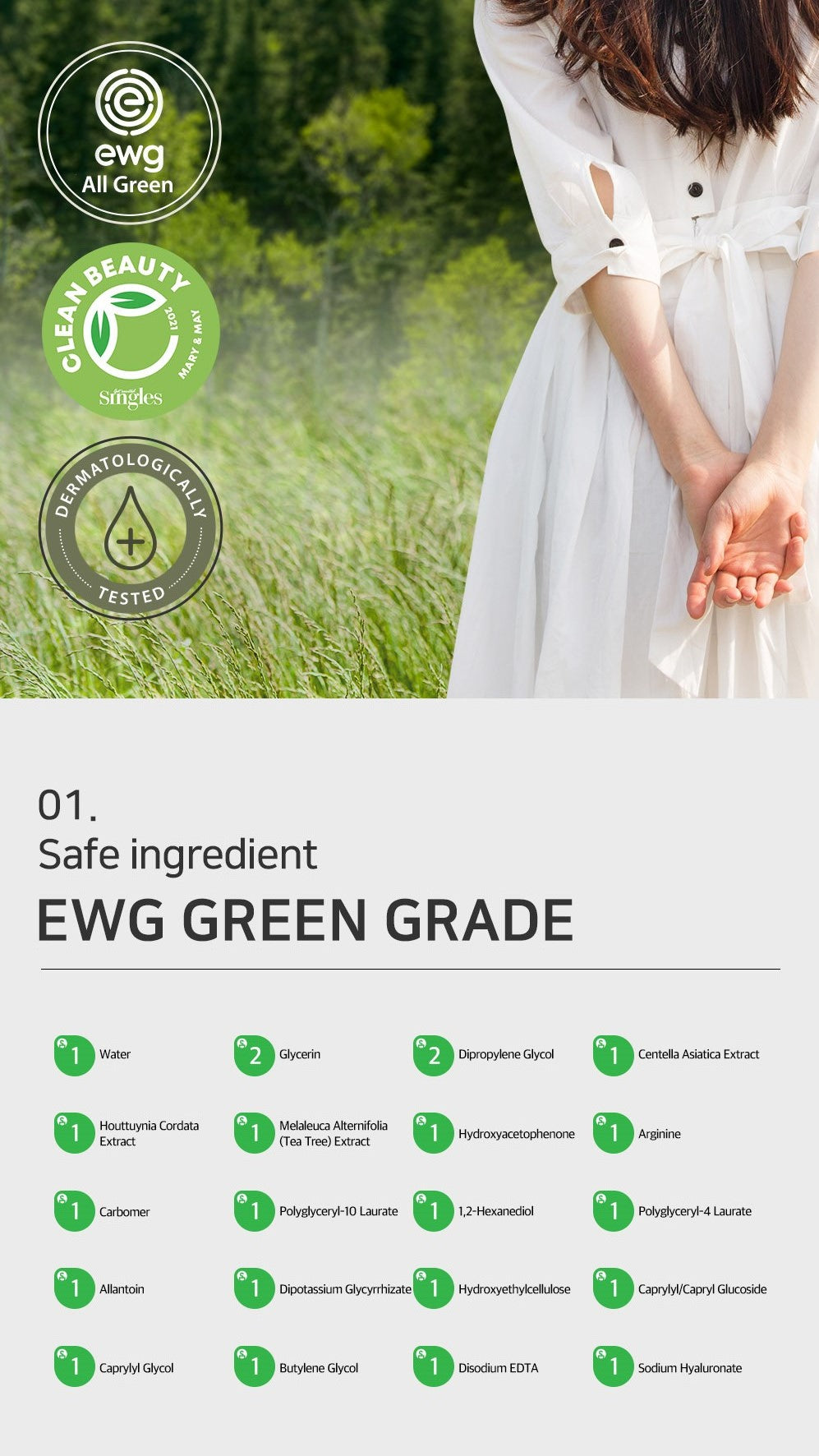 Water, Glycerin, Dipropylene Glycol, Centella Asiatica Extract(10,000ppm), Houttuynia Cordata Extract(10,000ppm), Melaleuca Alternifolia (Tea Tree) Extract(10,000ppm), Hydroxyacetophenone, Arginine, Carbomer, Polyglyceryl-10 Laurate, 1,2-Hexanediol, Polyglyceryl-4 Laurate, Allantoin, Dipotassium Glycyrrhizate, Hydroxyethylcellulose, Caprylyl/Capryl Glucoside, Caprylyl Glycol, Butylene Glycol, Disodium EDTA, Fragrance, Sodium Hyaluronate(50ppm)