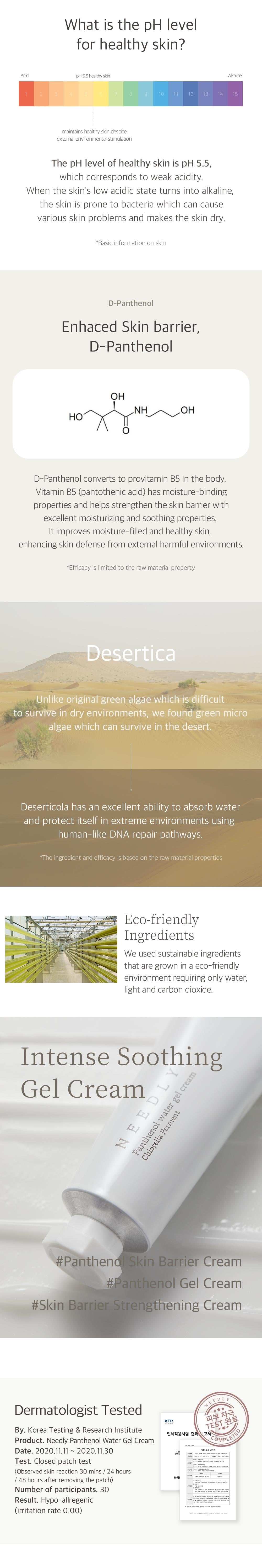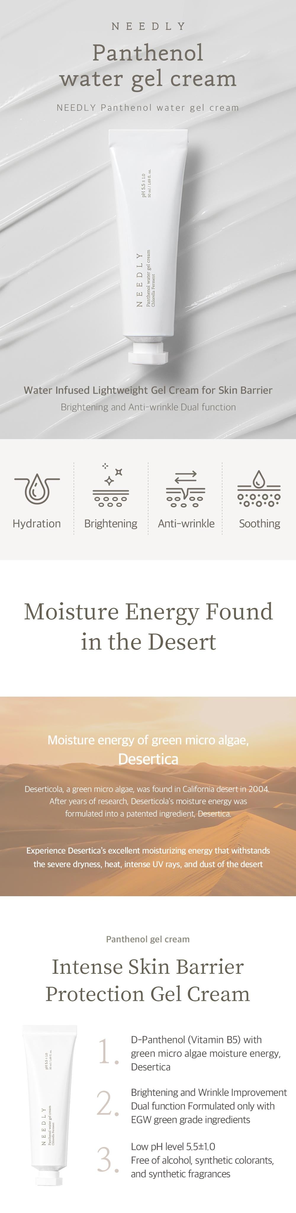 Needly Panthenol Water Gel Cream is a lightweight, water-infused gel cream designed to moisturise and protect the skin barrier. This cream feels extremely cooling and light on the skin, perfect for those with oily skin or prefer a light cooling sensation. Needly Panthenol Water Gel Cream is an intense skin barrier protection gel-cream that contains D-Panthenol (Vitamin B5) with green microalgae moisture energy, Desertica. Brightening and Wrinkle Improvement Dual function only with EWG green grade ingredients. Low pH level 5.5±1.0. Free of alcohol, synthetic colourants, and synthetic fragrances. Dermatologist tested by the Korea Testing & Research Institute.