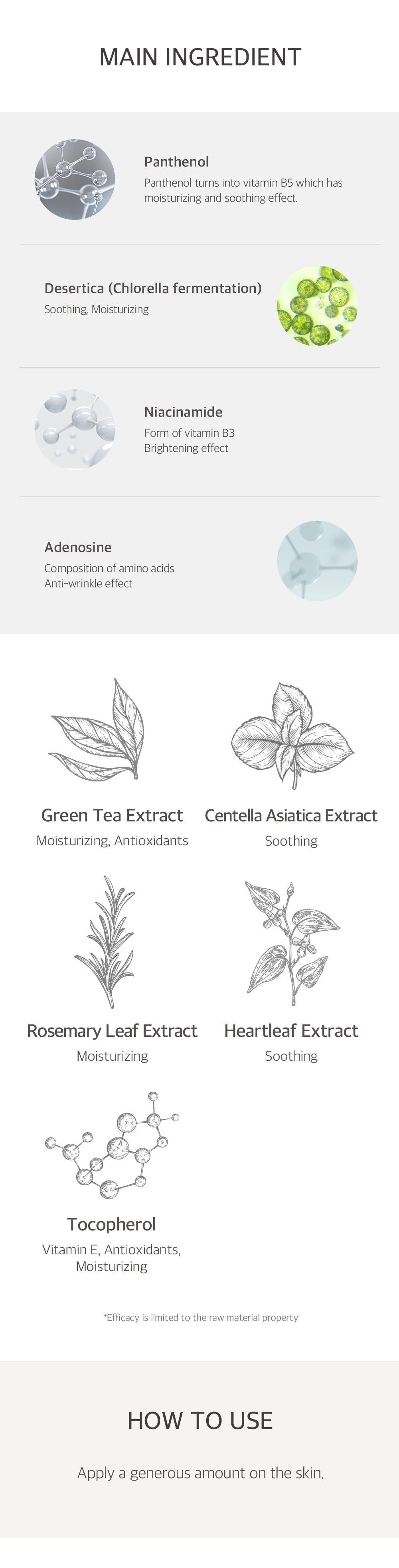 Water, Methyl Gluceth-20, Vinyl Dimethicone, Panthenol (2.99%), 1,2-Hexanediol, Cetyl Ethylhexanoate, Niacinamide, Butylene Glycol, Propanediol, Cetearyl Olivate, Camellia Sinensis Leaf Extract, Centella Asiatica Extract, Sorbitan Olivate, Sodium Polyacryloyldimethyl Taurate, Acrylates/C10-30 Alkyl Acrylate Crosspolymer, Hydrogenated Polydecene, Ammonium Acryloyldimethyltaurate/VP Copolymer, Rosmarinus Officinalis (Rosemary) Leaf Extract, Artemisia Vulgaris Oil, Ethylhexylglycerin, Adenosine, Chlorella Ferment, Trideceth-10, Disodium EDTA, Portulaca Oleracea Extract, Houttuynia Cordata Extract, Hyaluronic Acid, Hydrolyzed Hyaluronic Acid, Sodium Hyaluronate, Gossypium Herbaceum (Cotton) Extract, Tromethamine, Glycerin, Tocopherol.