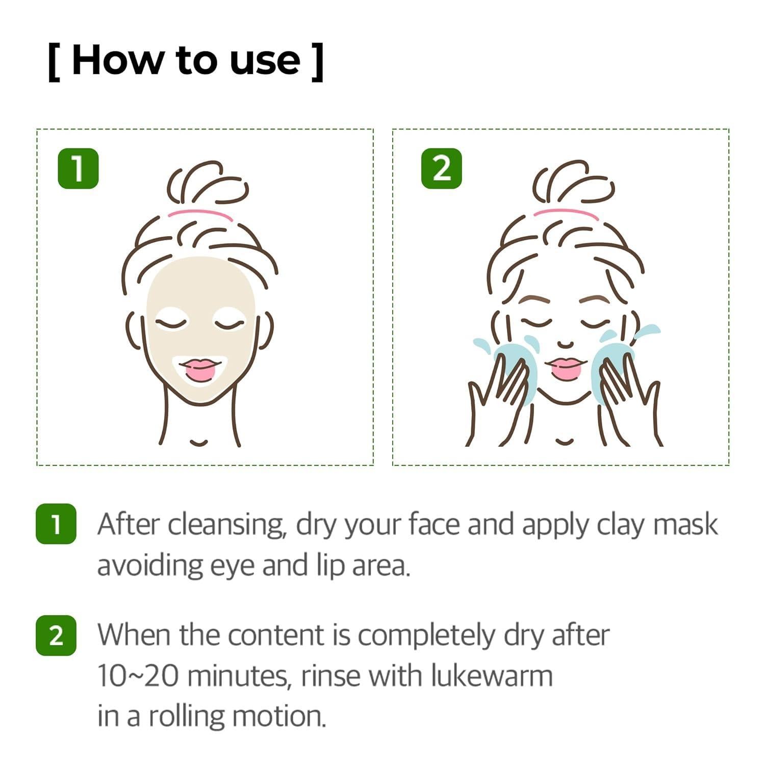 1) After cleansing, spread the clay mask on a dry face, avoiding eyes and lip area.2) When the content is completely dry after 10-20 minutes, rinse off with lukewarm water in a rolling motion.
