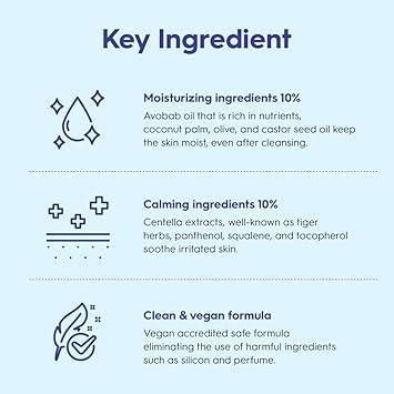Sodium Cocoyl Isethionate : Plant-based foaming agents Cocos Nucifera (Coconut) Oil : Hydrating moisture boost Persea Gratissima (Avocado) Oil : Hydrating moisture boost Centella Asiatica Extract : Skin Calming and soothing